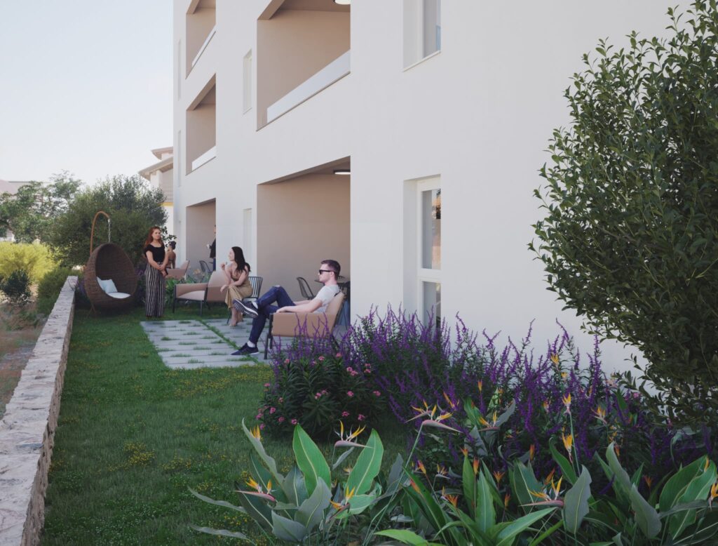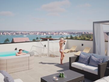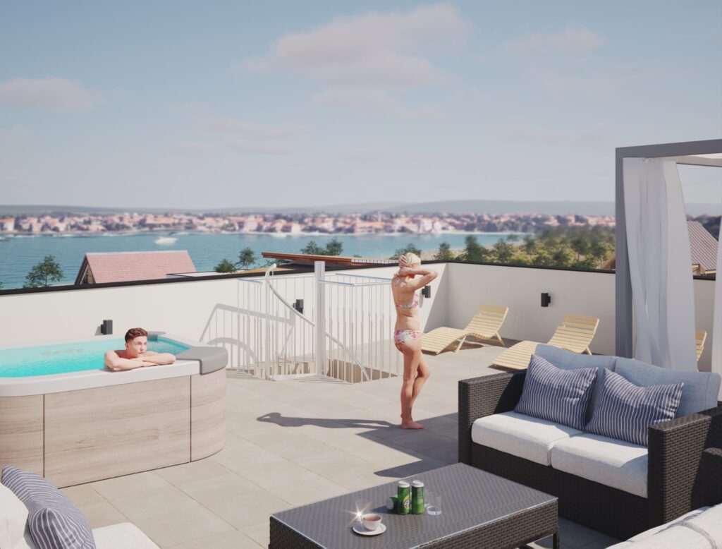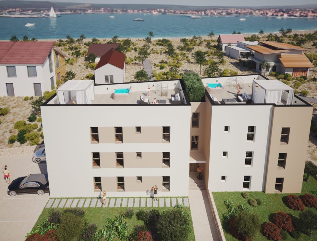 Zamieszkaj zaledwie 100 metrów od plaży w popularnym Sukošanie! Do wyboru jest 6 nowoczesnych apartamentów i penthouse’ów z 3 sypialniami, ogrodem, balkonem lub tarasem na dachu, z którego rozciąga się niezakłócony widok na morze.